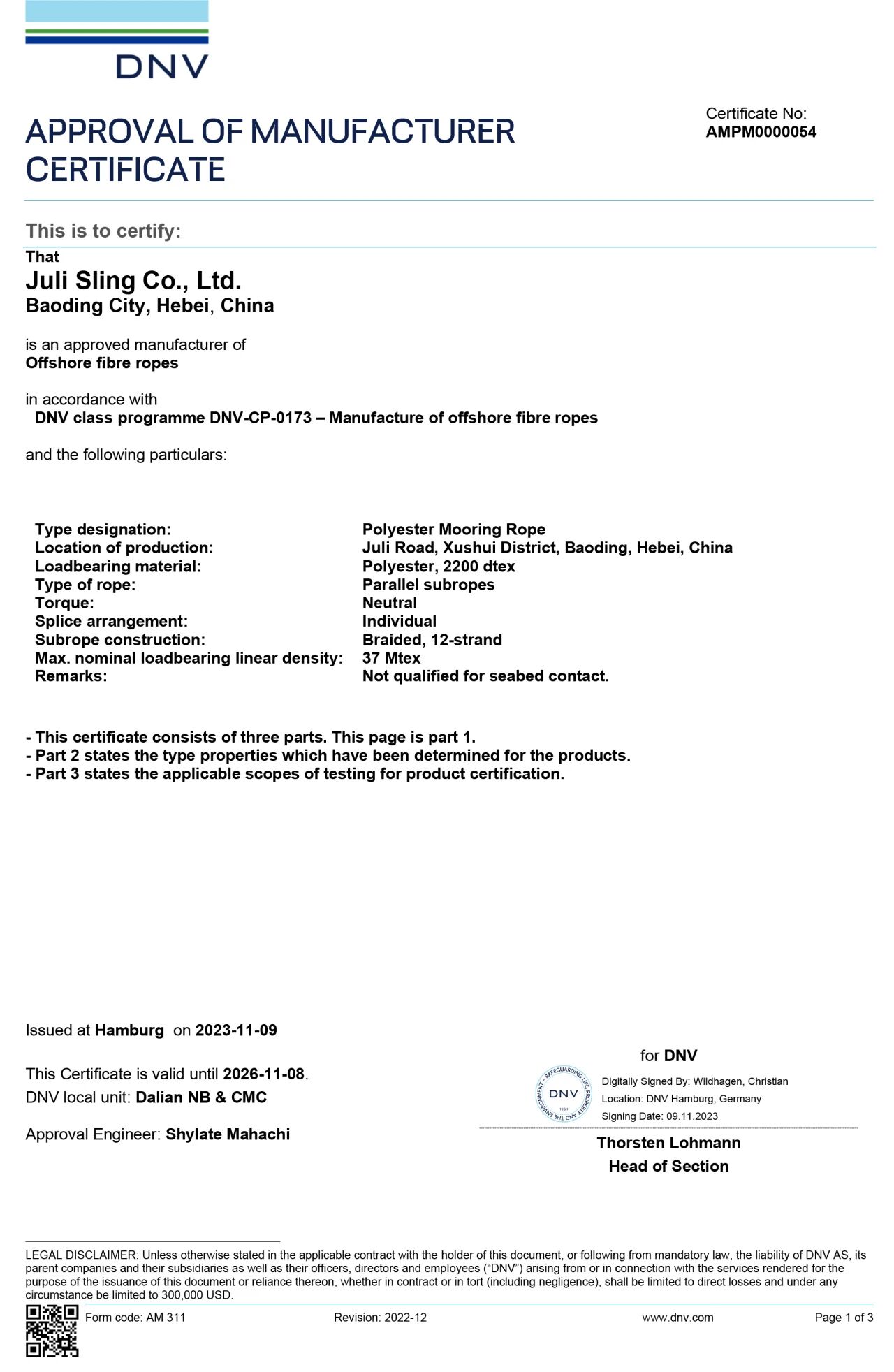 巨力索具前后取得挪威船级社(DNV)多项认证,慢慢构建起较为完全的系泊产物认证系统。△ DNV焊接工场承认证书△ 永远系泊用单股涂塑钢丝绳的DNV·GL工场承认证书△ DNV持久系泊钢丝绳讨论及缆绳套环锻件工场承认证书